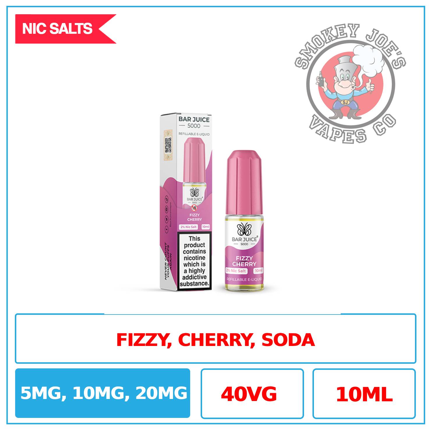 Bar Juice 5000 Fizzy Cherry Nic Salt features a 40% VG ratio, making it ideal for mouth-to-lung (MTL) vapers who prioritize robust flavour over massive clouds.