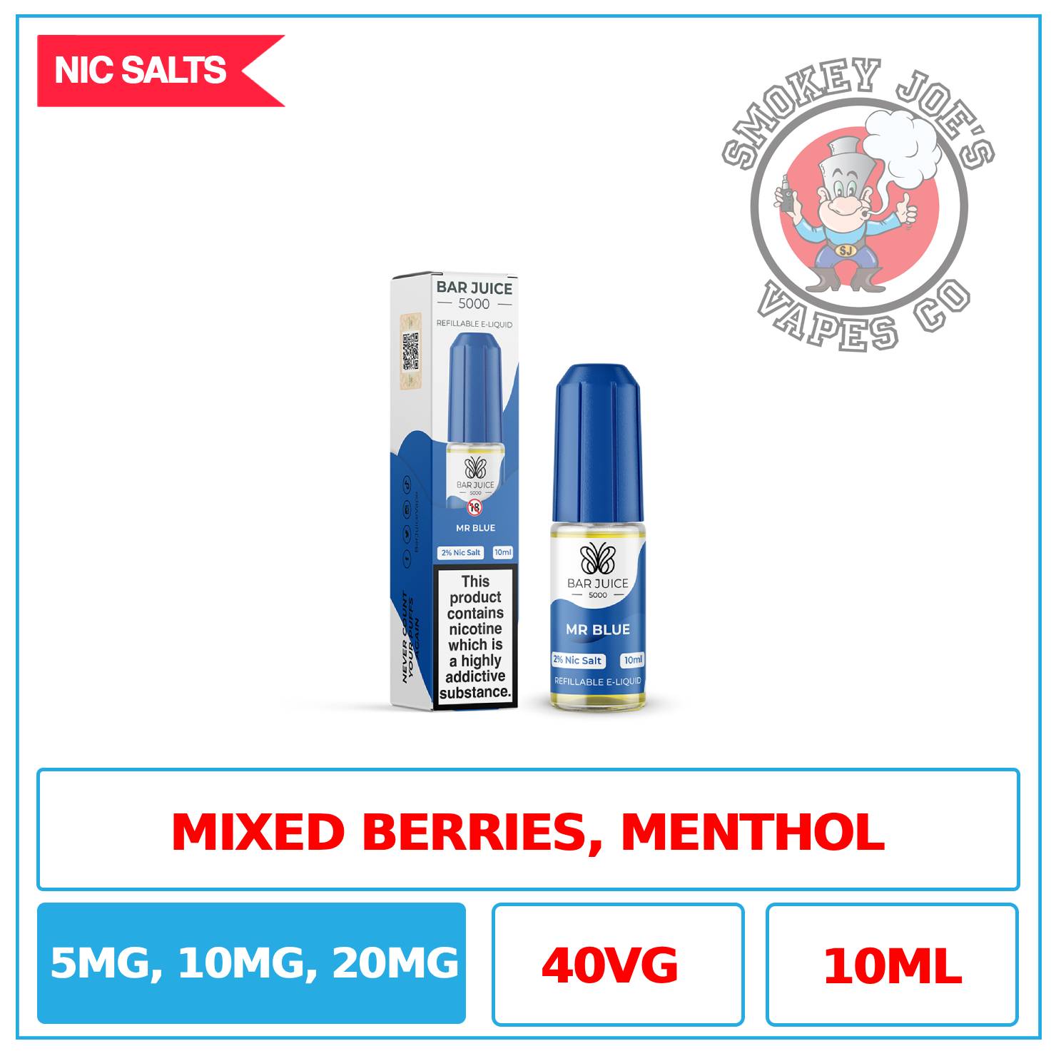 Bar Juice 5000 Mr Blue Nic Salt: Escape the ordinary and chill out with a blast of sweet and icy blue raspberry. Perfect for MTL vapers seeking a delicious, refreshing, and summer-inspired nic salt experience.