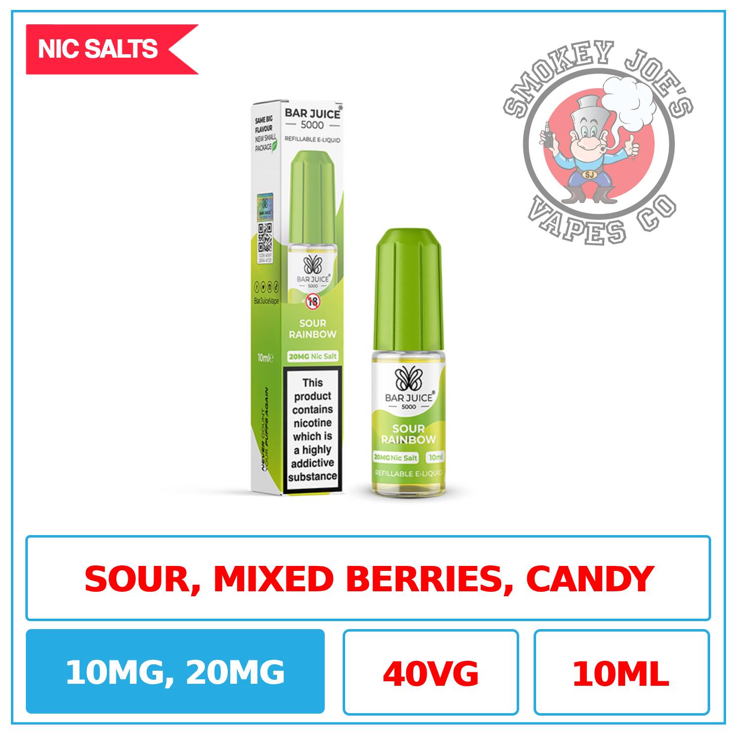 Bar Juice 5000 Sour Rainbow Nic Salt: Escape the ordinary and explore a world of exploding candy flavor with a lip-smackingly sour twist. Perfect for MTL vapers seeking a delicious, adventurous, and nostalgically tart nic salt experience.